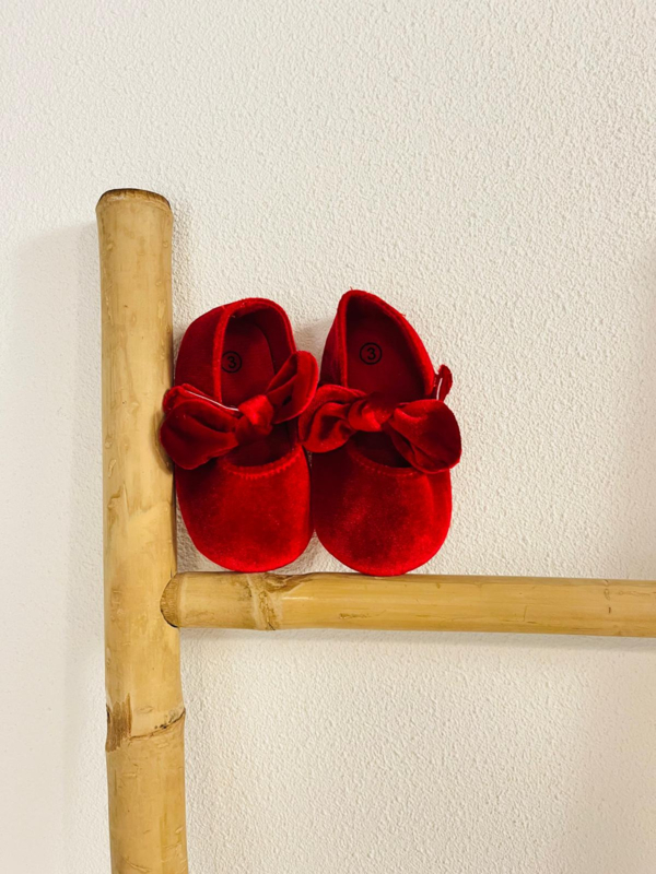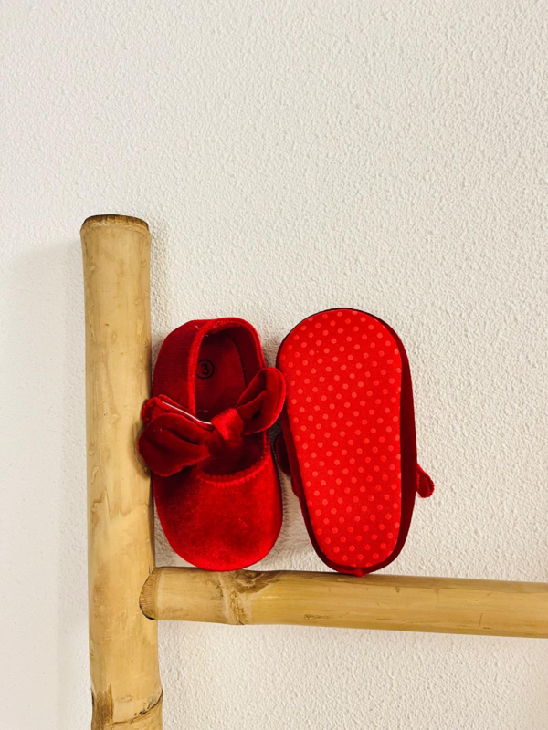 De strik zit vast aan de band die over het voetje gaat.