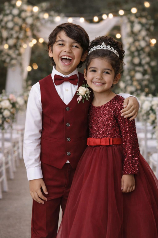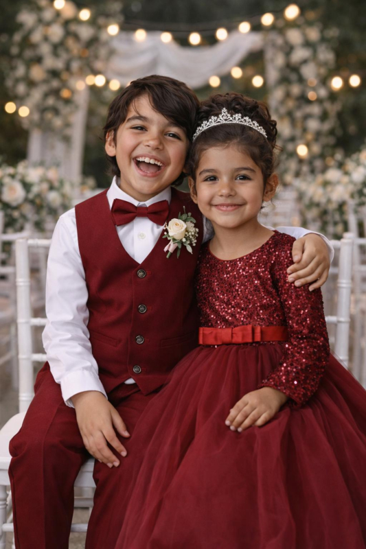 Op zoek naar een elegante kinder bruidsjurk in burgundy rood? Deze prachtige feestjurk is een echte blikvanger en perfect voor bruiloften, communies en andere feestelijke gelegenheden. De luxe glittertop is volledig afgewerkt met sprankelende pailletten, wat zorgt voor een chique en feestelijke uitstraling.