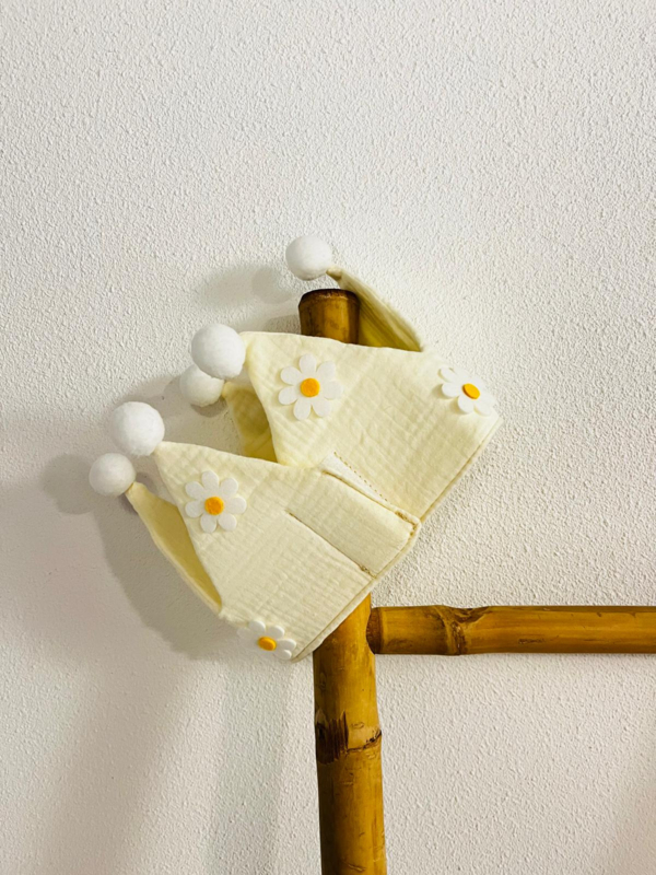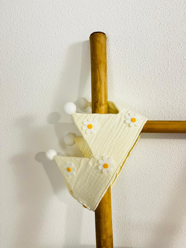 Prachtige stoffen kroon met daisy bloemen en pompoms.