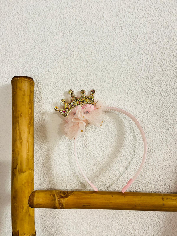 Een roze diadeem met een goud kroontje. Rondom het kroontje zit tule met gouden sterretjes.