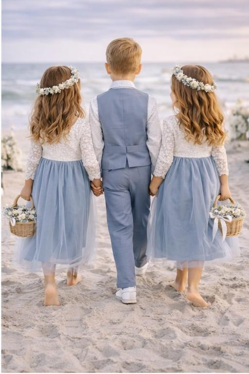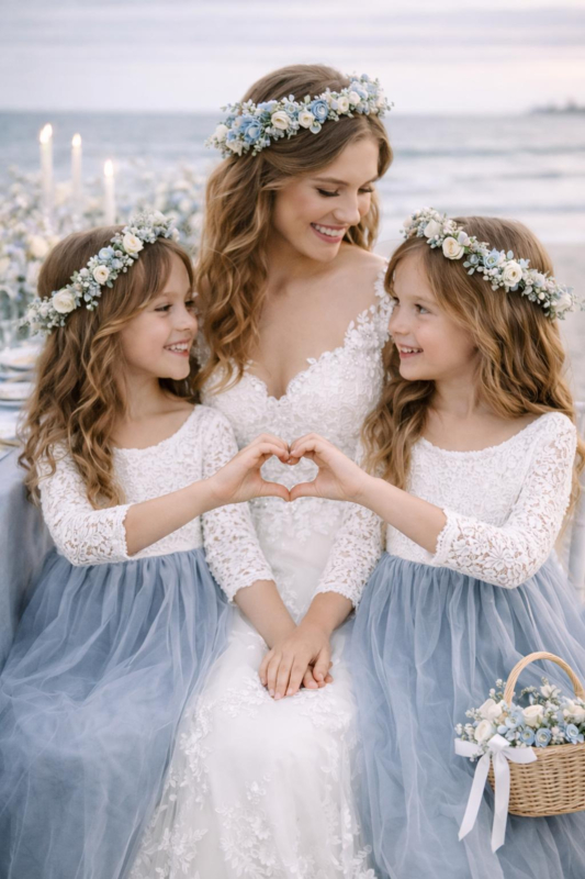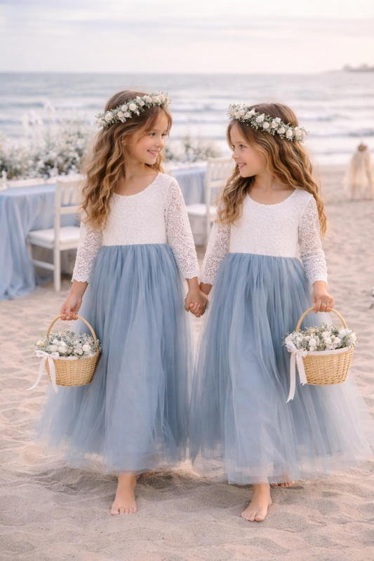 Lange romantische jurk kant en tule lange mouw dusty blue