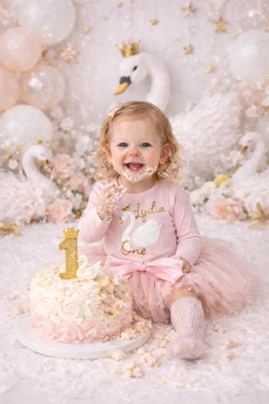 Zachte kwaliteit shirt of romper met bedrukking zwaan, one, two, etc en de eigen naam van je meisje.