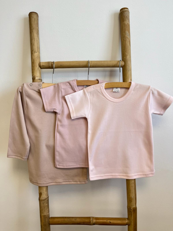 • Foto met 3 shirts (van links naar rechts): latte-deep pink- lichtroze