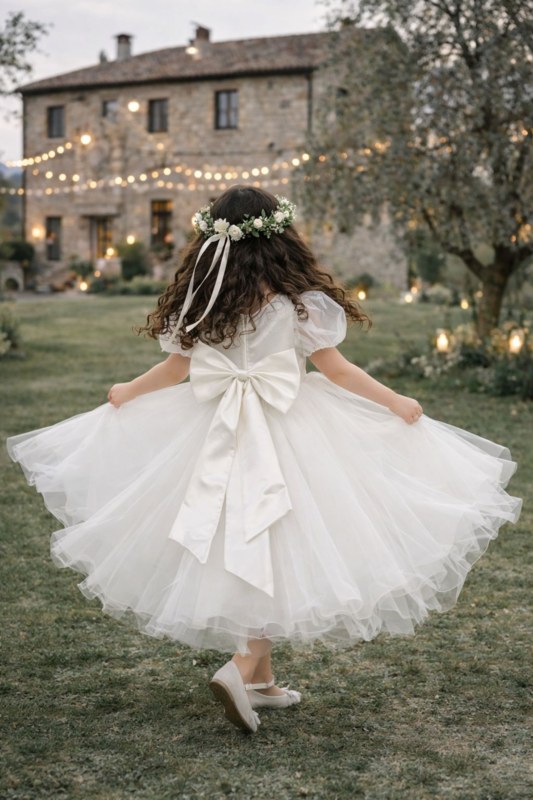 Het jurkje heeft een leuk pofmouwtje van tule over de schouders.